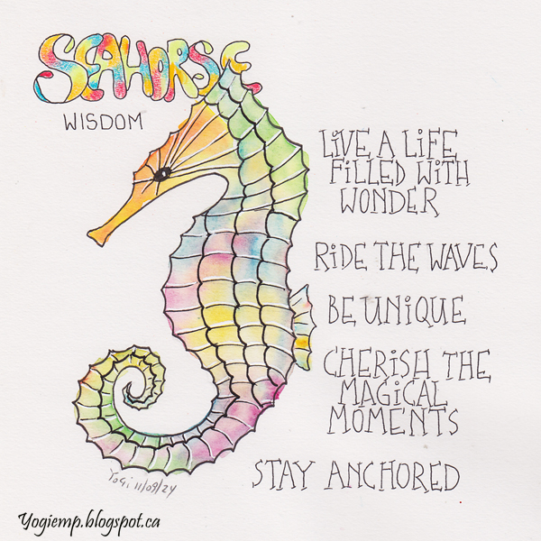 Seahorse WC - Seahorse Wisdom Created: Sept 11, 2024 Size: 6.5"sq On Canson Mixed Media paper drew out the seahorse using a Zig Writer, painted with various brands of watercolors in a very wet on wet technique and white details with Bleed Proof white and pointed pen. Title colored with Black Edition colored pen monoline. words: