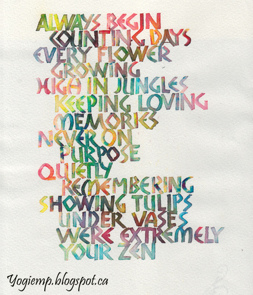 Created: September 8, 2021 It's a Guild Galleria Challenge for our Oct 2021 meeting. I can never remember what is allowed for this topic and when I looked it up, it was a little ambiguous... but one idea in the challenge brief was to use all the letters of the alphabet... which is what I did. On Arches Textwove paper, I sprinkled with Color Burst powders in Lemon Yellow, Rose Red and Ultramarine, then with a 2.4 Parallel pen dipped in water wrote out my piece in Neuland style. The image below is prior to the shadow outline of each letter with a micro pen. I like it better outlined, it pops more... Words: