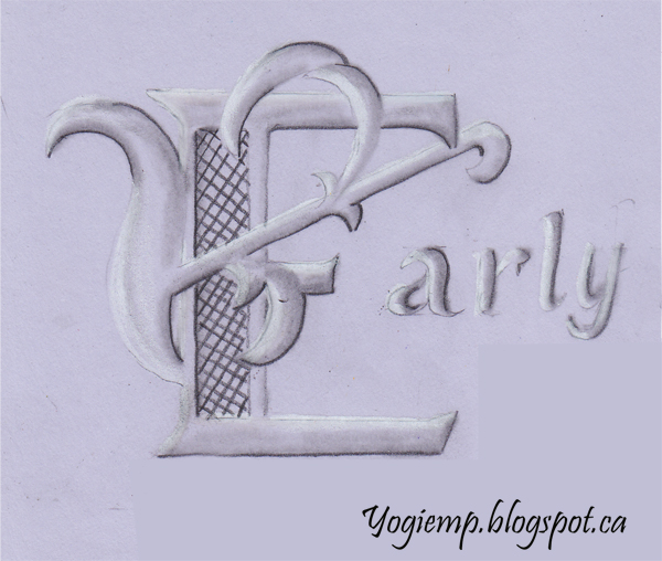 On a light bluish grey cardstock and using various pencils and a Prisma colored white pencil created the letter. (I love it... and I wish I knew where I originally came across it or even what style of lettering it is...)