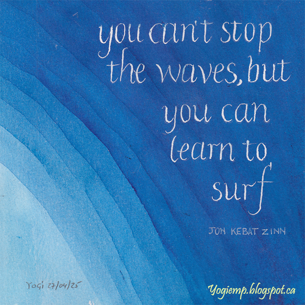 2025 size: 6"sq I was in a mood to some kind of blending w/c and this evolved... On St Armand 140# w/c paper. I mixed a large batch of diluted Daniel Smith Phthalo Blue (green shade) with water. Painted the whole page with that color, then painted over it with the same paint mixture leaving one section untouched (that very light blue). Repeated about 7 times before it wouldn't get any darker. I like doing this technique... It reminded me of the ebb and flow of waves. Added the text using a pointed nib and Bleed Proof white in a loose script style. words: You can't stop the waves, but you can learn to surf. Jon Kebat Zinn