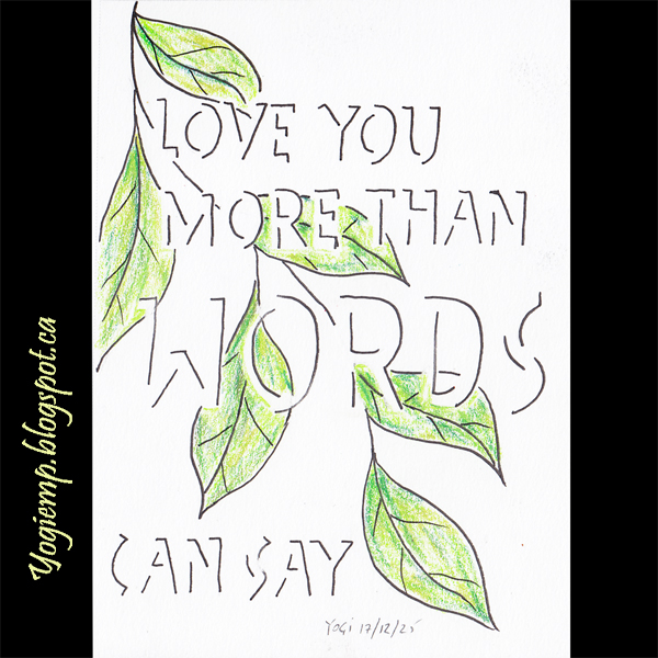 size: 4.5"w x 6"h On Canson Mixed Media paper drew my leafy branch with pencil, then creating the lettering and erasing the negative part of the letters. Colored with Prisma colored pencils. words: Love you more than words can say.
