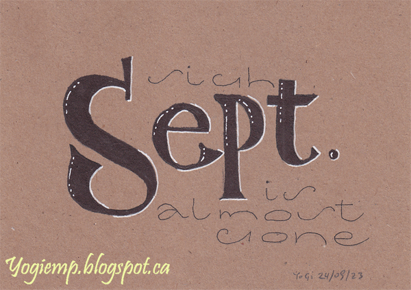 2023 I was feeling a bit down knowing Sept was almost gone and winter was too close for comfort... depressing. On Bogus Recycled Sketch Paper and using a Sharpie pen to write the large letters. Highlighted it with a white Gelly Roll 08 pen. Small Akim style text with a Juice Up pen words: sigh Sept. is almost gone.