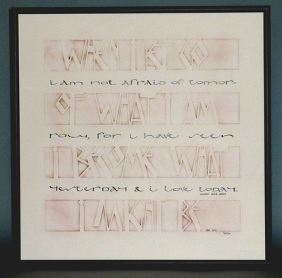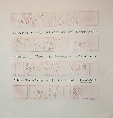 2010 Sorry for the images, but it's again a relatively white piece which is so hard to scan or photograph to get all the details. I wrote my main Neuland quote on regular white paper using a Parallel pen and black ink. I then scanned that, enlarged it and cut it with my Cricut. I then dry embossed it onto Arches90# watercolor paper. I sponged Distress stamp pads (Victorian Violet & Walnut Stain) over the high points to accentuate the letters a bit. I then wrote my other quote using a Mitchell nib (small don't know what size) and Sumi Moon Palace ink in a funky style lettering. |
