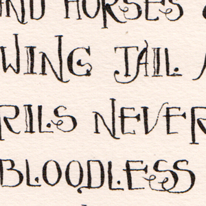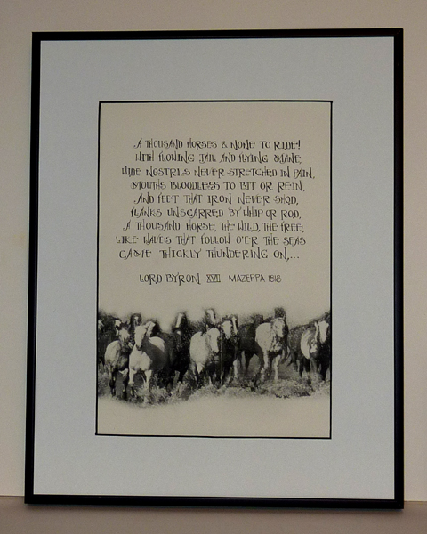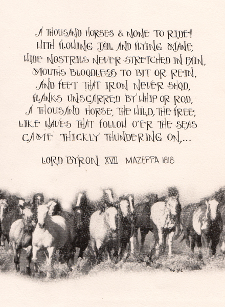 2012 This piece won a 2nd place ribbon. I love using a pointed pen and I recently came upon this font and the two just merged... I penned it with Moon Palace Sumi Ink. I also found the image on line, altered it and printed it out on Arches Text Wove in a very faded look. I wanted it to just be there, without a lot of definition. The quote: A thousand horses & none to ride! With flowing tail and flying mane, wide nostrils never stretched in pain, mouths bloodless to bit and rein, and feet that iron never shod, flanks unscarred by whip or rod, a thousand horse, the wild, the free, like waves that follow o'er the seas came thickly thundering on,... Lord Byron XVII Mazeppa 1818 |