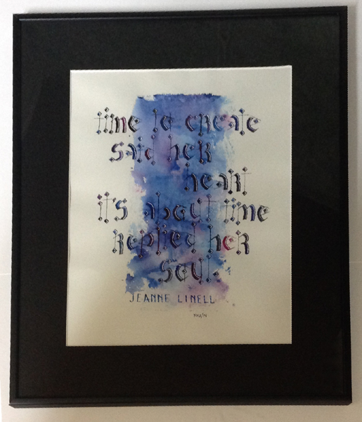 2014 Love this quote. Using a Neuland variation style text (Peter Taylor style). Entered into the Stampede 2014 contest, but didn't win any ribbons for it. Sigh!! Quote: Time to create said her heart. It's about time replied her soul. Jeanne Linell |