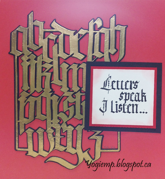 Size: 10"w x 10"h This was the first take I did but found it a bit too large. Cut the letters at 8"w x 9.5"h. Inked with pigment ink and embossed with Emerald Creek "Mirror Gold" embossing powder. Layered to a shadow layer of black, then onto a deep red cardstock. Inked the quote, trimmed down, layered to red and then black cardstock, then onto the cut letters. |
