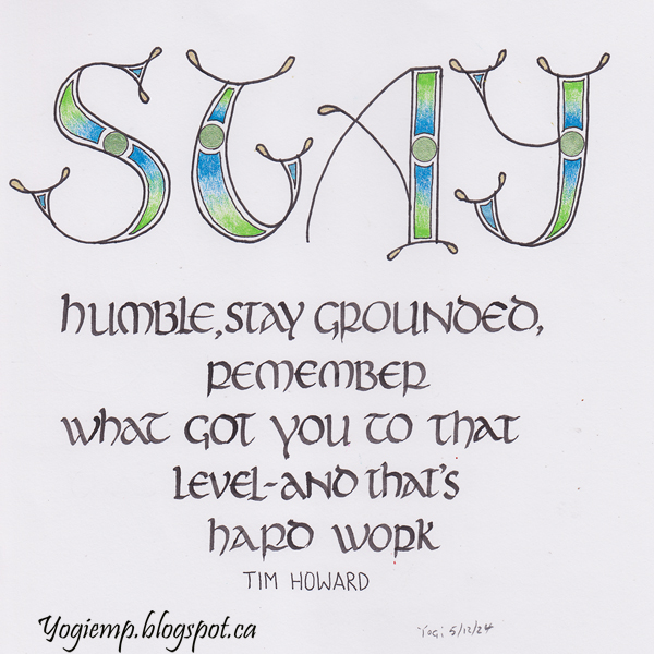 size: 8"sq On Edge Mixed Media paper using a Zig Writer and Black Edition colored pencils. created the title, and the balance of text with an empty 2.4 parallel pen and Sumi ink in Uncial style. words: Stay humble, stay grounded, remember what got you to that level - and that's hard work. Tim Howard |