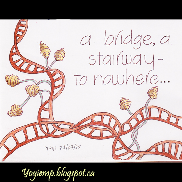 size: 6"w x 4.5"h Just started doodling and that ladder thing evolved and then I added the funky plant thingies... On Canson XL Pen & Ink Paper, ZIG Writer, Prisma colored pencils. Weaver style writing with a Zig Writer. words: A bridge, a stairway - to nowhere... |