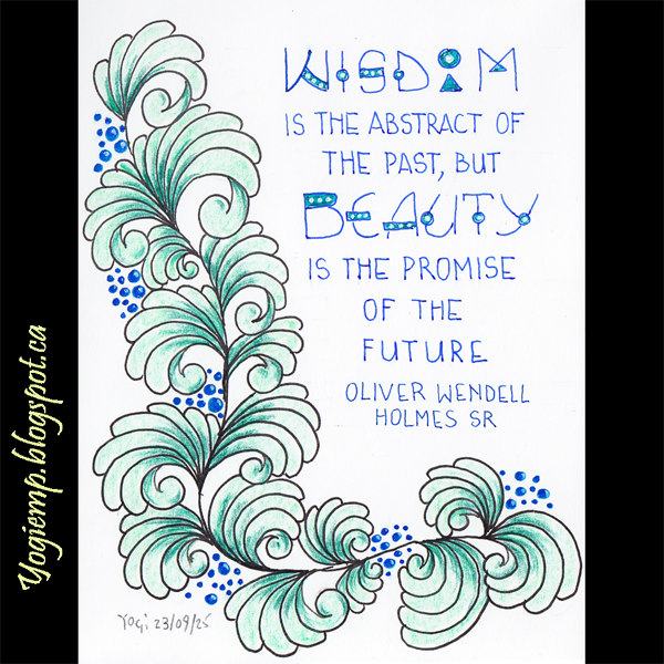 size: 4.25"w x 6"h On Canson Pen & Ink paper, created my Doodle design using a Zig Writer and colored with Prisma Colored pencils adding gel pen circles. Text with a med blue Juice Up pen and gel pen in Rennie style lettering, words: Wisdom is the abstract of the past, but beauty is the promise of the future. Oliver Wendell Holmes Sr.