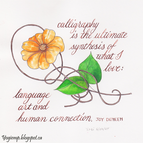 Tangled Floral - Joy Deneen Quote Created: July 7, 2024 size: 6.5"sq On a Canson Mixed Media paper drew out the tangled flower and painted with Peerless watercolors. The quote written with a Nikko G pointed nib and a bunch of brown Ecoline inks I mixed together in my style of script writing... words: Calligraphy is the ultimate synthesis of what I love: language art and human connection. Joy Deneen