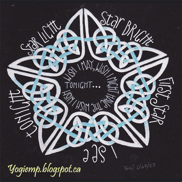 2023 After our last Celtic Knot session till September I decided to play with the knot that's been intriguing me - the Triangle Break, but this time within a circle. And since I did one on white paper I wanted to do one on Black... On Fabriano Black/Black paper. Since this design is a continuous loop I had to blend my blue with the silver (Sipa Metallic pens) to get the definition of over and under strokes... Outer writing with a Unibal Signo white gel pen and inner writing with a Juice Up pen words: Star light star bright first star I see tonight wish I may, wish I might, have the wish I wish tonight.
