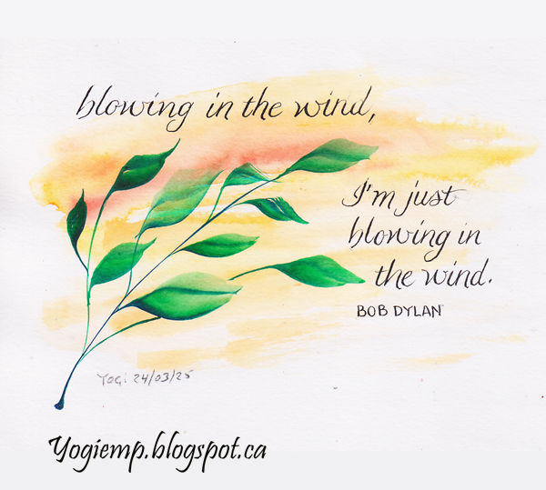 Triangle Brush Leaves - Blowing In The Wind Created: March 24, 2025 size: 5.75"w x 4.5"h I was playing with one of my Rosemary & Co triangle brushes (#6) and recent purchase of w/c paints (bought for Lorraine Douglas class) (bkgrd: DS New Gamboge & WN Perm Alizarin Crimson; leaves: DS Perm Green, Winsor Blue grn shade) on Fabriano mixed media paper. Used a pointed pen and Sumi ink for the text which was going thru my mind... words: Blowing in the wind, I'm just blowing in the wind. Bob Dylan