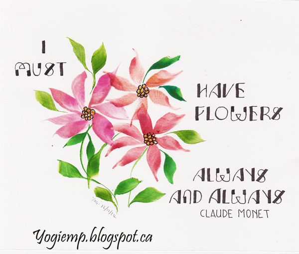 size: 7"w x 5.5"h At my recent BVCG Play Day I created this floral design, then add the quote. I bought 3 of these triangle brushes - but for the life of me I can't find the middle size which was my favorite... On Canson Mixed Media paper created the floral design,then found a quote I like and added that using a black Zig Calligraphy pen - smaller nib in an unknown font style I found online. words: I must have flowers always and always. Claude Monet |