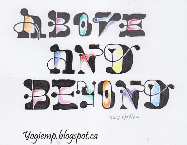 2022 A friend introduced me to this style of fun lettering, so I thought I'd play a bit... Font style is Trὕf Creative by Monika Kehrer and Adam Goldberg On Edge Mixed Media Sketch Book paper using a 2.4 Parallel pen and Sumi ink created my letters... Colored with Prisma Colore pencils. |