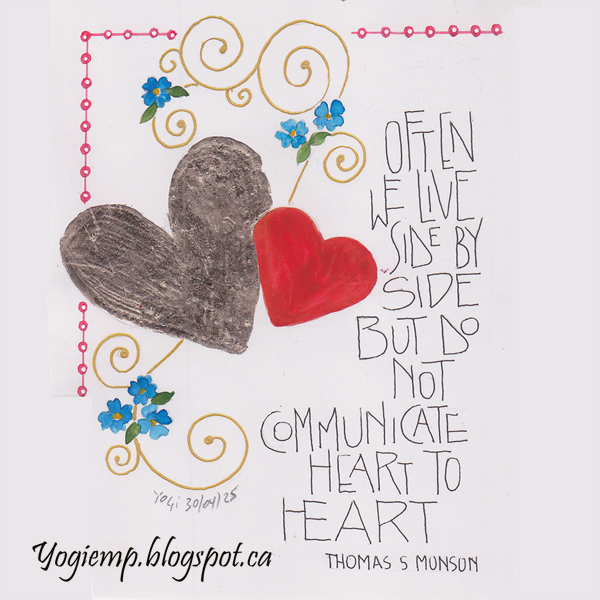2025 size: 4.5"w x 6"h I think this is the worst gilding I've ever done even when I was initially learning the tech... I have a lot of size in my drawer so have been using them one at a time. This one is going in the garbage... On Canson Mixed Media paper using watercolors, gel pen. Text written with Juice Up pen. words: Often we live side by side but do not communicate heart to heart. Thomas S Munson