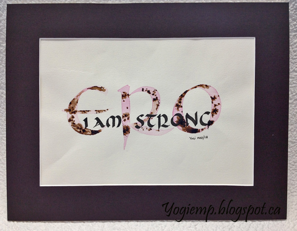 Strong This was the Third piece I did. It was actually the first quote I came across when reading and started me on looking at these phrases... I used a no name brand multi purpose pad paper. The Hungarian word was done with a Taklon 1/2" brush saturated with water and just the tiniest tip dipped into a pink paint. I immediately sprinkled with walnut powder, then continued with the next letter. Allowed to dry, then did my English text with a 3.8 Parallel Pen and the Sumi ink. |
