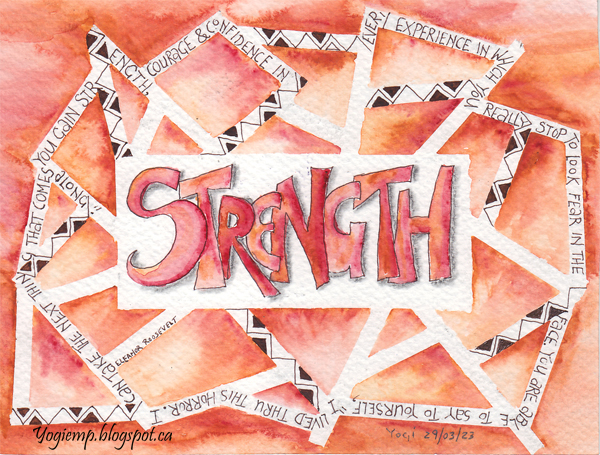 2023 Again I came across something that inspired me and which I haven't done in ages... masked off lines and w/c painted. and that's how it began. When the painting was done I didn't know in what direction to go in next...So some of my friends threw out words and I latched on to one of the, Google'd quotes about it and this is the result... On Fabriano 1264 CP W/C paper. masked off my design and the large inner rectangle. Painted with Winsor Newton Gold Ochre and Permanent Alizarin Crimson. Created a bunch of little strips with various doodles to see which I would like best... Wrote in the quote using a Juice Up brown pen. Drew out the central word in my funky style and painted with the same colors. Quote: You gain strength, courage & confidence in every experience in which you really stop to look fear in the face. You are able to say to yourself "I lived thru this horror. I can take the next thing that comes along". Eleanor Roosevelt |