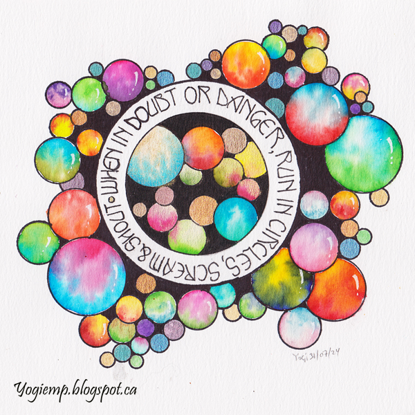 WC Circles - When In Doubt Created: August 1, 2024 size: 8"w x 7"h After doing the squares watercolor I felt like doing one with circles. Done on Canal Paper - St Armand. Drew the center large circles for my text. Then drew all the other circles again with the extra fine point Sharpie... It was still a little too juicy so my lines again are thicker than I wanted. Painted with Peerless watercolors. Text written with the Sharpie pen. words: When in doubt or danger, run in circles, scream & shout. |