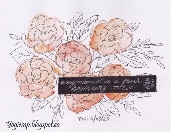 2023 Sprinkled Bister powders on Fabriano 1264 Mixed Media paper and using a relatively large round brush created the bloom shapes. When dry added outline elements using a Juice Up pen. Created the black area with a Sharpie pen and then wrote the quote using a white Juice Up pen. words: every moment is a fresh beginning. TS Eliot