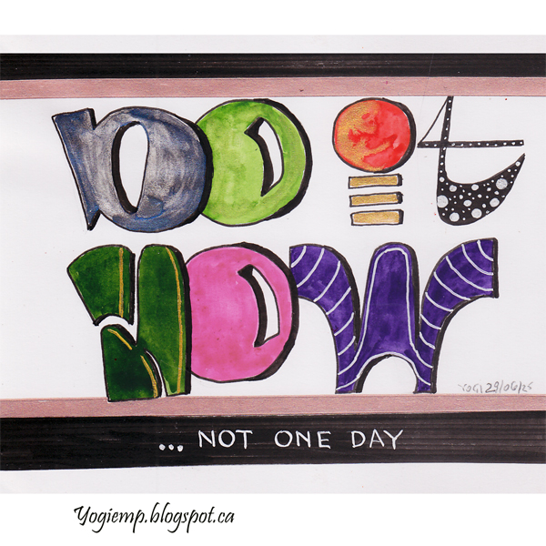 size: 6"w x 4.25"h On Canson Mixed Media paper using watercolors, Finetec metallic paint, gel pens and ZIG Writer. words: Do It Now ... not one day |