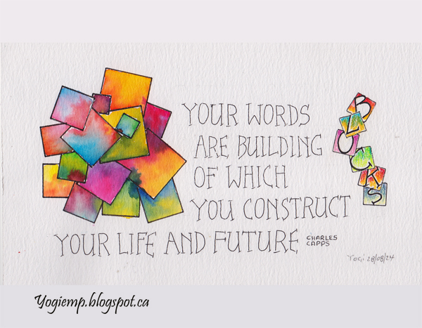 29, 2024 Size: 7.5"w x 4.5"h"sq On Canal WC paper St Armand outlined the squares with a Zig Writer and painted with Peerless WC. Text written with a Juice up pen, and since I missed adding the word "blocks" I creatively added them in a design element... words: Your words are building blocks of which you construct your life and future. Charles Capps