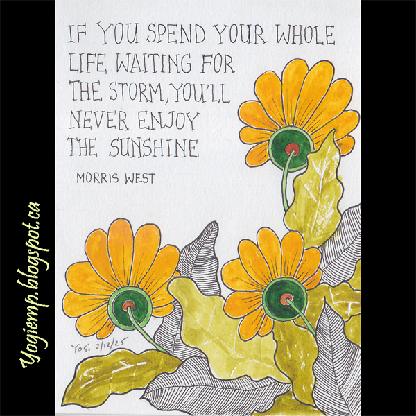 size: 6"h x 4.5"w On Canson Mixed Media paper created the floral artwork, painted with various brands of watercolor and linear work with a Juice Up pen. Words done with the Juice Up pen in my serif style lettering... words: If you spend your whole life waiting for the storm, you'll never enjoy the sunshine. Morris West