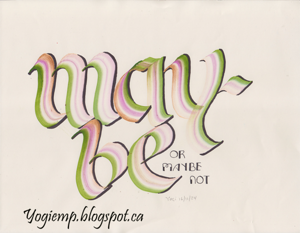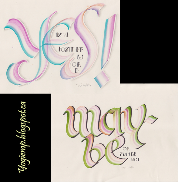 size: 9"w x 7"h (both approx) At my recent BVCG Play Day I created these 2 pieces playing with my Copic Marker. YES: On Genoa Bond Calligraphy Paper double dipped my wide Copic marker into a blue and magenta gouache and wrote out the letters for "yes" in a funky style. Shadowed the right edge with a Caran d'Ache B pencil and paper stump. Added the text with the smaller tip of a Zig Calligraphy pen. words: Yes is a positive word. MAYBE: same as "YES" except for using 3 colors (olive green, Magenta and Gold). Shadowed with the Zig Writer. Same text style. words: Maybe or maybe not.