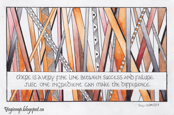 2023 I was in this mood to do an abstract line painting... so drew my lines with a Zig Writer and then painted and doodled them while playing with the gals. It originally was meant as a vertical piece... but then I changed that to incorporate the quote. On Canson Mixed Media paper using watercolors painted the lines in a shaded effect. Added Micron .02 doodling in some and shadowed other lines with the Zig Writer. Text written with a Juice Up pen in an Uncial style words: There is a very fine line between success and failure. Just one ingredient can make the difference. |