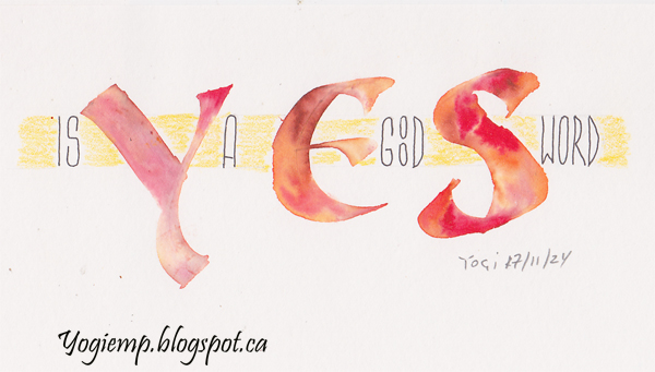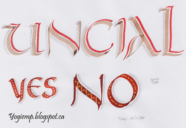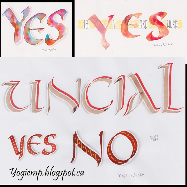 Uncial and Yes/No (bottom image): The Uncial word was written with a 3.8 and a 2.4 empty Parallel pen using a crazy mix of Ecoline ink I had in a jar (the brownish color) and a reddish. Graphite shadowing. The Yes and No were also done with some crazy mixes... shadowed and doodled with a white or gold gel pen. |