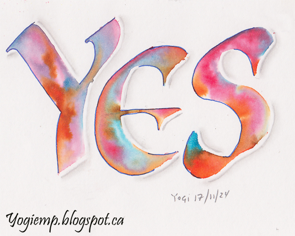 I'm taking a 2 day class with Barb Fuller (a BVCG Guild Member) in Uncials. It's one of my favorite hands... but does take up a lot of room especially since I don't like using small nibs... On Canson Pro Marker paper for the 2 smaller Yes words on the top row. I used a Simply Simons #10 chisel brush (for both "Yes's") - which is a touch smaller than 1/2" and loaded it with water - one letter at a time. Dropped in Ecoline inks into the wetness. Blotted it a bit so it would dry faster... First Yes: shadowed on the right side with a Caran c'Ache B pencil and paper stump. Outlined on the left side with a medium toned blue Juice Up pen. Second Yes: wrote