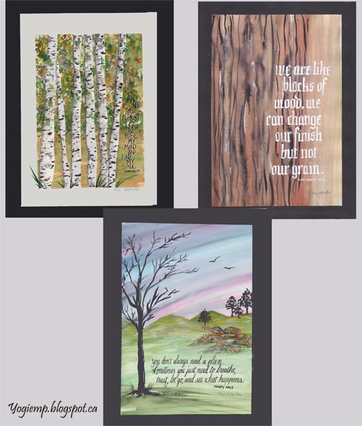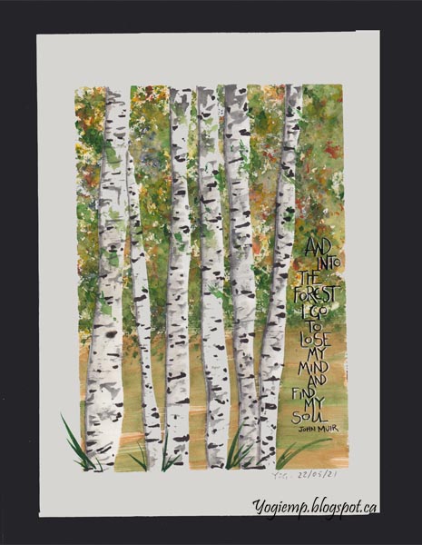 ID: Birch Trees - And Into The On Arches 90# HP watercolor paper. This is another Birch tree painting I really like. Wrote my text with a pointed pen and Sumi ink, when dry shadowed with Holbien's Permanent white gouache. Quote: And into the forest I go to lose my mind and find my soul. John Muir