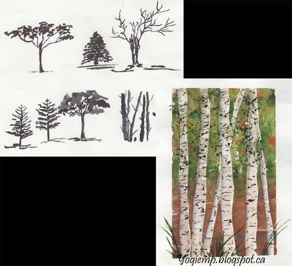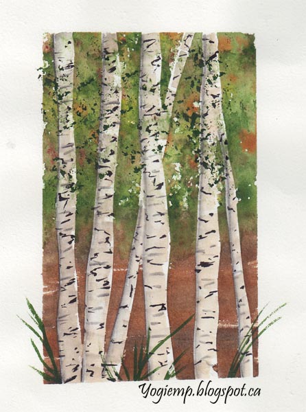 ID: Practice - Birch Trees On Arches Text Wove paper. We masked off our outside border then created Birch trunks from the masking tape. Lay them here and there, relatively straight but with some tilting for interest. Sponged (I used a sea sponge) the background foliage with various shades of green, yellow, red and blue... Swiped across the bottom section with some browns. When dry'ish, removed the tape. Put a light dirty water coat on the trees (rather than have them totally white) then added our tree markings with some black and some pencil for tonal values. When totally dry added pencil and paper stump shadow along one edge. Sponged a bit of foliage on the front of the trees. Final touch some grass sprigs in the foreground. On the good one I'll add calligraphy. |