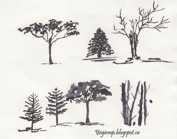 ID: Practice - Silhouettes On Arches Text Wove paper. I used a Pentel Pocket Brush pen, but Barbara used some Sumi ink with a brush.