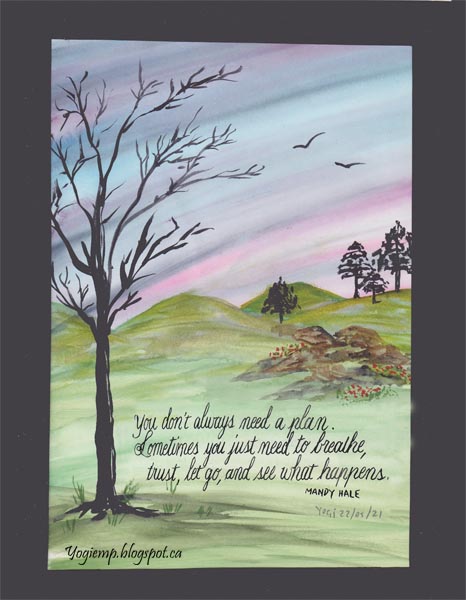 ID: Silhouettes - You Don't Always On Arches 90# HP watercolor paper. I painted in my sky and foreground, rocky area. Added the silhouette trees then the calligraphy with a pointed pen and Sumi ink in a Copperplate style. Quote: You don't always need a plan. Sometimes you just need to breathe, trust, let go, and see what happens. Mandy Hale |