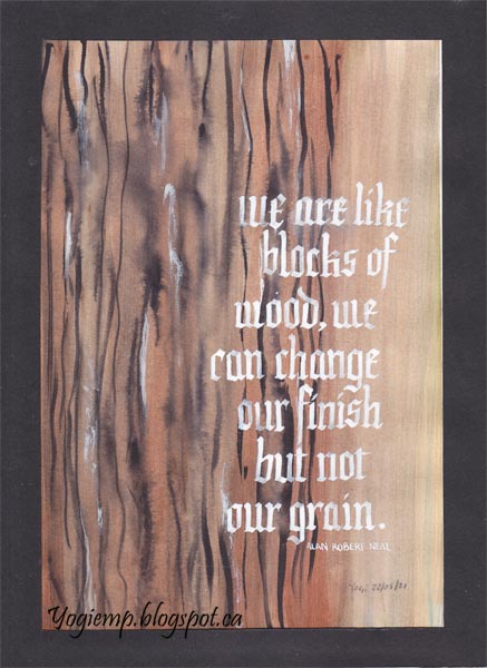 Blocks Of Wood On Arches 90# HP watercolor paper. Doing bark is not as easy as it looks... There are probably 6+ layers before I got something I liked. Wrote the quote using a 2.4 parallel pen and Holbien's Permanent white gouache in a Blackletter style. Quote: We are like blocks of wood, we can change our finish but not our grain. Alan Robert Neal |