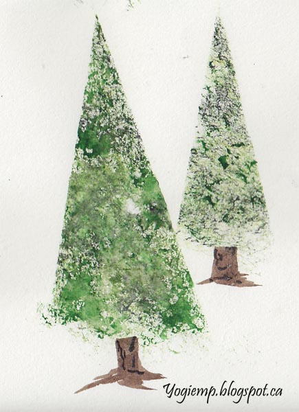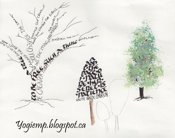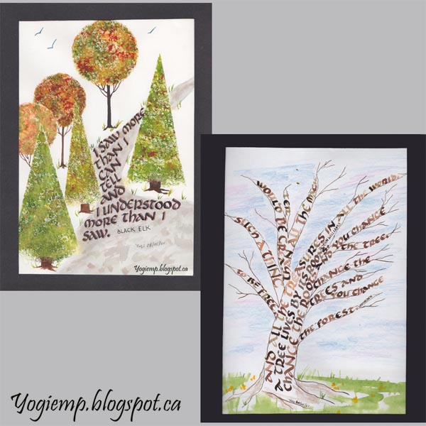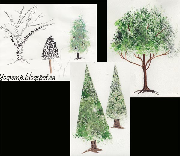 ID: Sponging - Ornamental Trees On Arches 90# HP watercolor paper. Masked off each tree, one at a time then using various watercolors and both a sea sponge and a basic rectangular sponge created my trees. Wrote in the words with a 2.4 Parallel pen and Sumi ink, then shadowed with a pointed pen and red paint.