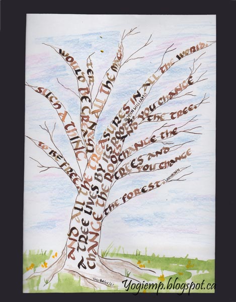 To Be Free On Staples 110# white cardstock penciled in my tree and wrote the quotes using a 2.4Parallel pen and various brown Holbien gouache. Colored pencil sky and watercolor grassy area. Quote 1: To be free. Such a thing would be greater than all the magic and all the treasures in all the world. Robin Williams Quote 2: A tree lives by its roots. Change the roots and you change the tree. Change the trees and you change the forest. unknown |