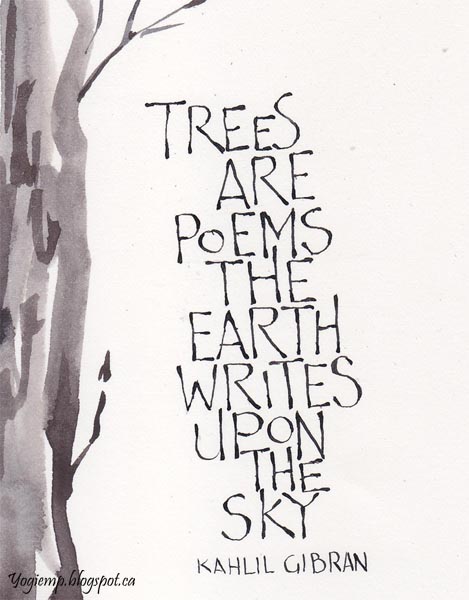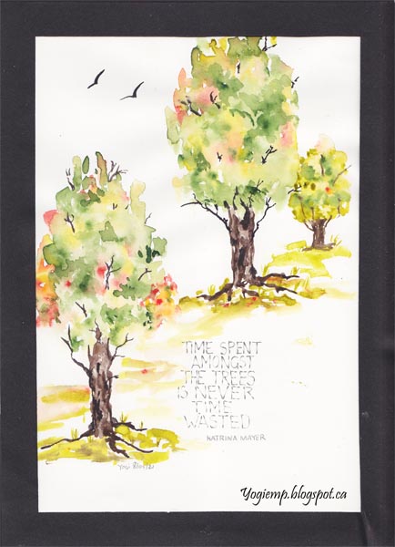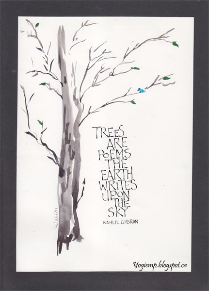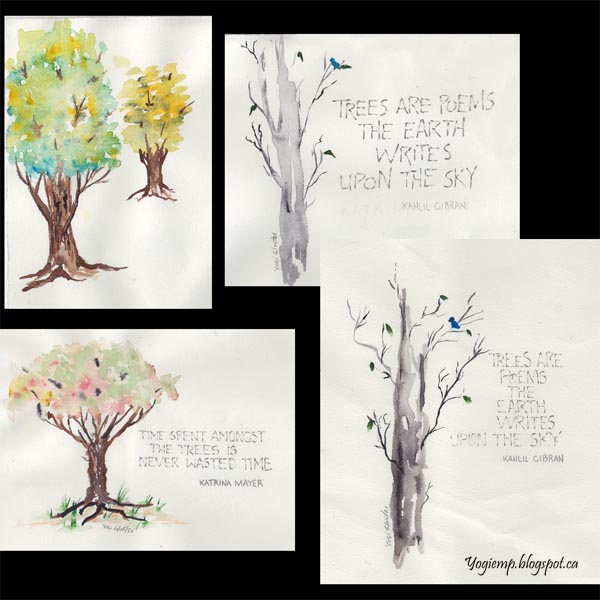 ID: Scrumbling, Bare Trees and pressure release lettering I worked on Arches Text wove to practice. Apply water with a paint brush here and there in tight kind of formation leaving un-wet areas, drop in color, mush around a bit getting light, medium and dark areas. Paint in the trunk in various intensities (not just one tonal value). When foliage is dry add the branches. For the are tree I used dirty water adding some browns and blacks. A couple leaves here and there and a little blue bird - couldn't resist... Wrote the quotes with a 5.b pencil. The 2nd time with a bit more definition in the tree and a tighter cluster of lettering. Still not quite right so will work on it on my final piece. Quote 1: Time spent amongst the trees is never wasted time. Katrina Mayer Quote 2: Trees are poems the earth writes upon the sky. Kahlil Gibran |