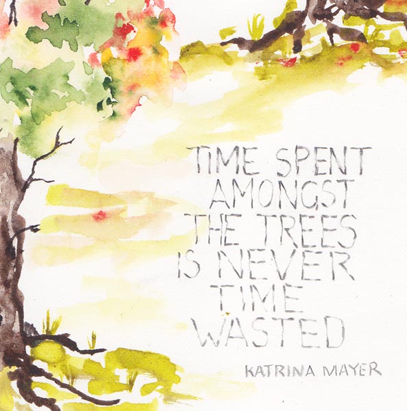 ID: Time Spent Amongst The Trees On Arches 90# HP watercolor paper, Pressure Release letters with a Caran d'Ache Grafwood B pencil |