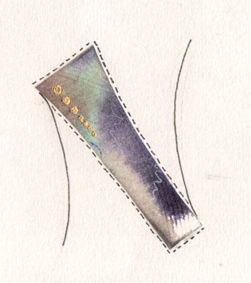 I love the way this looks like birch bark but in wonderful colors. Using the template, swipe your color, in this case dry brush watercolors, off the edge and into your stroke shape from both sides. Blend a bit with water and just work it till you have the results you like. Shaded the top with colored pencils. |