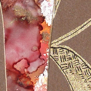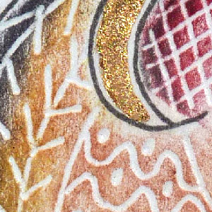 I was just playing in between other demos... I doodled designs onto a piece of white cardstock using a fine tipped stylus, then using the flat of my Prisma colors colored in the areas, The pencil just skimmed over the embossed designs. I deepened the colors in corners. I then added gold leaf and the pencil shading. |