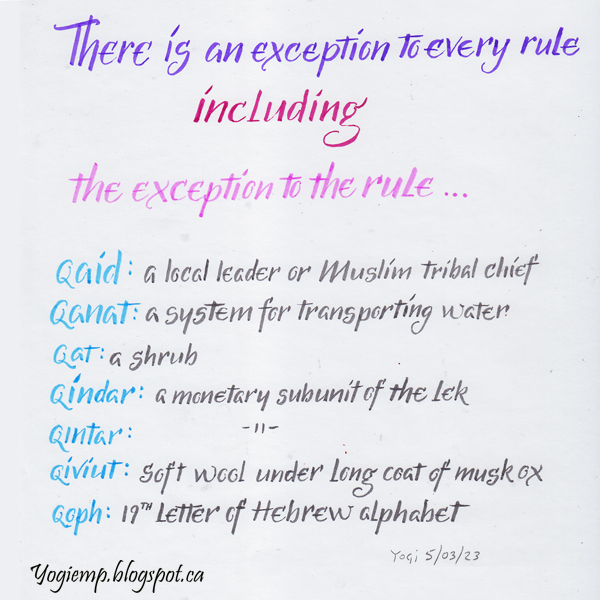 2023 I signed up for a 2 day class with Brecken Cook thru the Idaho Inkspots Calligraphy Group. I've always struggled with brush lettering. I don't know how many brush pens I've bought over the years looking for that ONE that would make me smile... This time I'm playing with my Koi watercolor brush pens. They're a touch too soft for me for lettering. Someone mentioned having "u" after "q" so I thought I'd write the words with descriptions of words without "u" after "q". ROFL... On Canson Pro Layout Marker paper used various colors of Koi watercolor brush pens. There's a lot that needs work on...