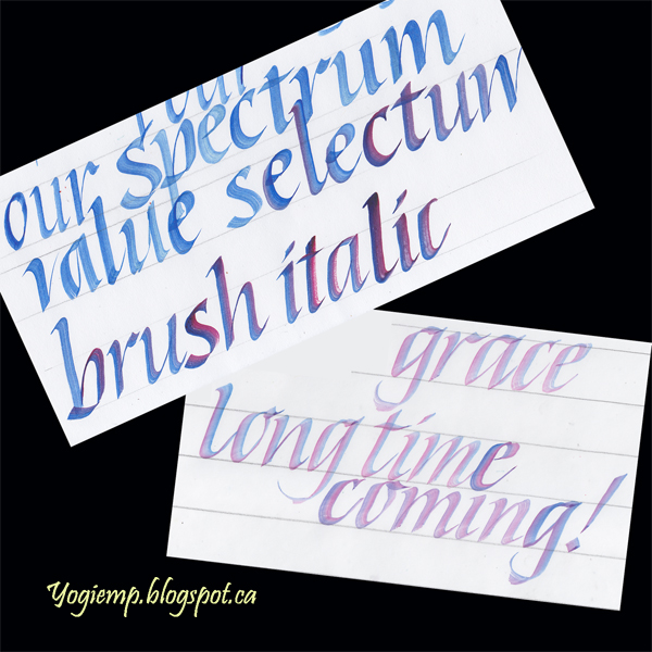 2023 My Guild BVCG hosted Viktor Kams to teach us a bit about Brushie Italics... I've always struggled with brush lettering. I don't know how many brush pens I've bought over the years looking for that ONE that would make me smile... On Canson Pro Layout Marker paper using watercolors, double dipped into Winsor Blue and Magenta with a 1/4" white Taklon Selectum (23-974) brush. I like this one from all the brushes I was trying... I have a ton of flat brushes... Now I just need to find one in a smaller size that will work as well. I'm liking the results of some of my descender swirly endings. I've always struggled with them... still do. Below is a pic of portions of some of my practice sheets... for example look at the "b" ending, couldn't get it to swirl... but I LOVE the "g" endings.
