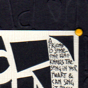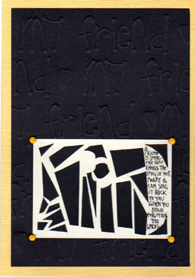 BVCG - Repeat - My friend #1 Modified: April 30, 2009 April 09 Galleria has a theme of Repeat - peat - peat. In other words we had to do something that repeated itself, be it color, lines, words, whatever. This also works for the AngelClogsBlogspot Challenge for Apr 25th I made a plastic stencil for the words "my Friend" and cut it out using a Crop-A-Dile to punch the holes at the tips of the letters. I used a heavy weight black cardstock and dry embossed the words as a background design. I then made an ATC sized inset of the words "my Friend" doing the technique from Carrie Imai's class, where you made a monoline design, cut it out and rearranged/skewed it onto another piece of cardstock. I used an off yellowish white Bazzill monochromatic cardstock for the light area and a plain black cardstock for the other portion. Wrote in my quote with a very fine tipped black Micron pen.Attached it to the background with yellow brads. Mounted this to a bright yellow Bling cardstock. Quote: A friend is someone who knows the song in your heart and can sing it back to you when you have forgotten the words. |