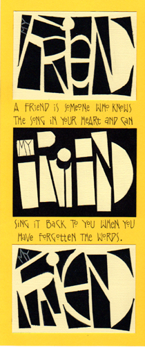 BVCG - Repeat - My friend #2 April 09 Galleria has a theme of Repeat - peat - peat. In other words we had to do something that repeated itself, be it color, lines, words, whatever. I made ATC sized insets of the words "my Friend" doing the technique from Carrie Imai's class, where you made a monoline design, cut it out and rearranged/skewed it onto another piece of cardstock. I used a cream toned yellow Bazzill monochromatic cardstock for the light area and a plain black cardstock for the other portion. Attached it to the main bright yellow card leaving enough space between the insets for my quote. Wrote in the quote with a fine tipped black Micron pen. Quote: A friend is someone who knows the song in your heart and can sing it back to you when you have forgotten the words. |