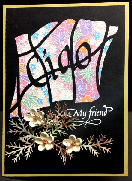 I cut the word out of black cardstock. Adhered a piece of Chiyogami paper behind it then onto a chartreuse toned side folded card. Stamped the sentiment with Versamark pad and embossed with white embossing powder. Adhered some of my quilled flowers I did at a recent quilling session. (They sure are coming in handy...) Punched some fern leaves from my marbled papers. |