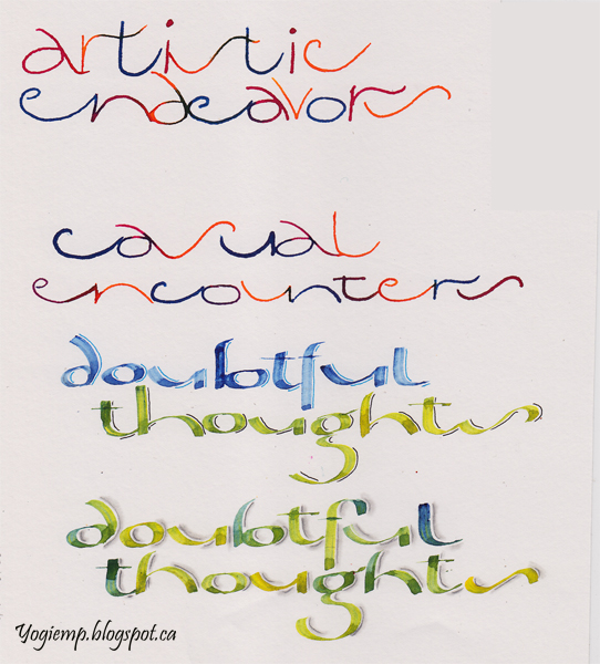 After practicing the basic letterforms Carrie had us do a few pieces with multiple words. I used a glass pen for the 1st 2 and for the bottom 2 a Speedball C-2 nib all with Ecoline ink. On the bottom 2 I added a shadow line with a Juice Up pen and on the bottom image graphite shading and paper stump. I like the bottom one... |