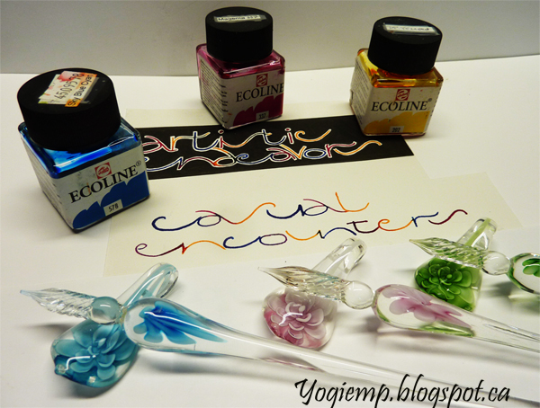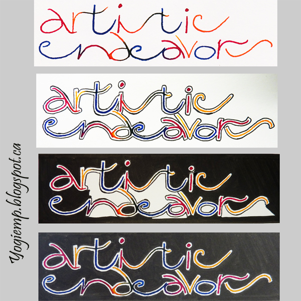Artistic Endeavors On Canson mixed Media paper wrote out the words using the glass pens and 3 colors of Ecoline ink (Sky Blue - Cyan, Magenta and Deep Yellow) allowing the ink to merge with the previous color. Below you can see one of the word pieces and then working my way down to full black background using a Zig Writer. |