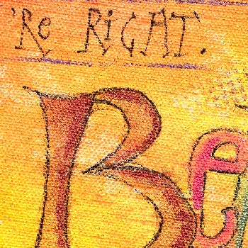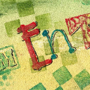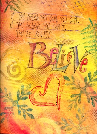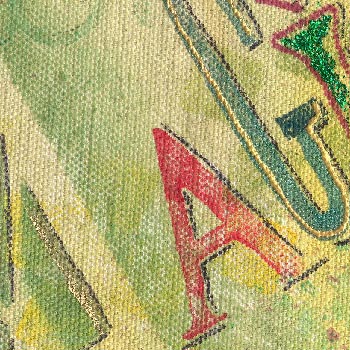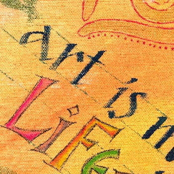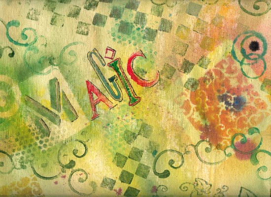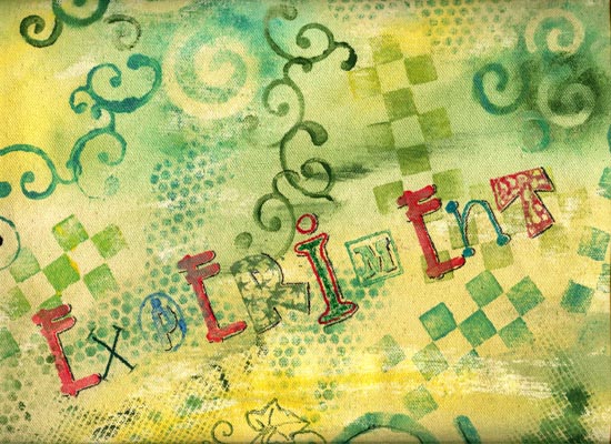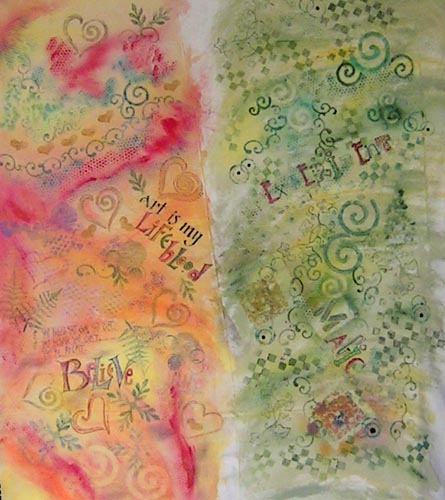 30"w X 38"h Created: February 22, 2009 I started out with the yellow/orange/reddish tones, did some stamping and stencilling on it and then left it. Then started working on the green portion which I was inspired with as I was progressing. I used and unprimed canvas and Delta Ceramcoat & FolkArt craft paints to paint the background and used a lot of water to move colors around so they blended with each other. Then I used several foam stamps and stencils with Metallic paints mostly FolkArt, Making Memories, and Lumiere. Some of the stamps I made myself using adhesive backed thin foam and punches or Sizzix dies, then stacking them together to make a thicker payer. I also ran some stencil plastic through my punch or with the Sizzix die, so I had a good variety of positive and negative shapes to work with. The lettering for "Experiment" & "Magic" was done with rubber stamp letters and a couple hand drawn ones too. The words "LifeBlood" & "Believe" were hand drawn with thick Micron and then colored in with Bic MarkIt pens and some Sharpies. The text for "believe" was done with a Micron pen as well. The words "art is my" was done with a Parallel pen and FW acrylic ink. There are some horizontal lines which were done with the border waste from sheet rubber stamps. Added some zap with a glue pen and Ultra Fine glitter on the "i"s