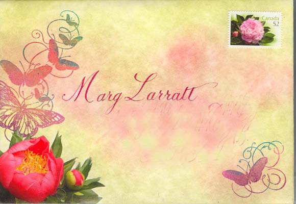 Size: 5.25" h x 7.25" w I used a Grumbacher's Paper for Pen & Ink. Cut out the peony from the stamp package and colored the background of the envelope with Pan Pastels (Bright Yellow Green Tint & Shade, Some Permanent Red & it's Tint). Rubber stamped the butterfly/flourishes (Stamp-It Australia set#010) using pigment ink in various colors and clear embossing them. Wrote my text with a Nikko G nib and Ecoline ink "Magenta" in a script style of writing. |